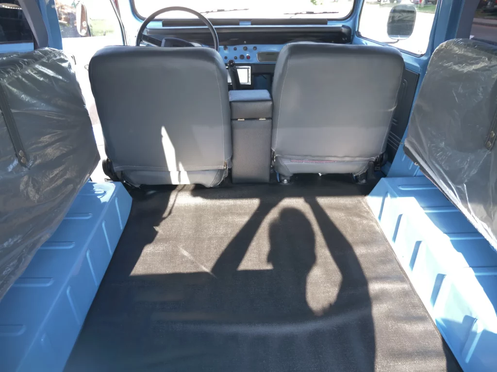The undercarriage of this vehicle is quite clean and features no rust. Moving to the back one can see the spare tire carrier and the pull up hatchback style door that is typically found on many earlier FJ40’s. These doors open to the rear cargo area that houses two foldable bench seats that sit opposite to each other, and they still feature the wrapping from when the seats were restored. Moving up to the front one can see the two bucket seats, which also have been restored. Sitting in between the two seats is the gear shifter, transfer case shifter, parking brake, cup holders, and center console. Along with this the vehicle features a backup camera. Moving to the driver’s seat, one can look behind the steering wheel to see the different gauges. The odometer that reads a bit over 114,000 miles sits snug within the speedometer. Below this are gauges for the oil, fuel, temperature, as well as the battery.
